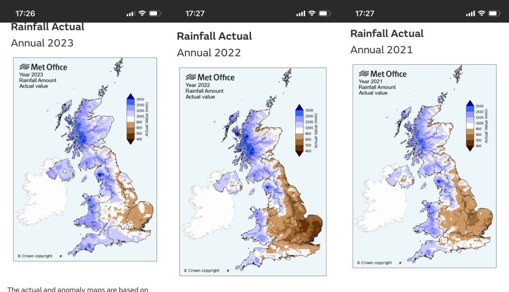 One item they’ve already trailed as a reason for the poor performance is the rainfall in 2023. They are talking about ‘exceptional’ rainfall, ‘which clearly they couldn’t plan for’ …. except that’s really not the case. The south west area rainfall in 2023 was not significantly different to the 2015-2022 pattern, and it was 2022 which was the outlier (approx 25% less rainfall compared to average years). As can be seen from the Met Office rainfall charts below, the South West had about 1,200mm rain in 2023, slightly less in 2021, and about 900mm in 2021.
